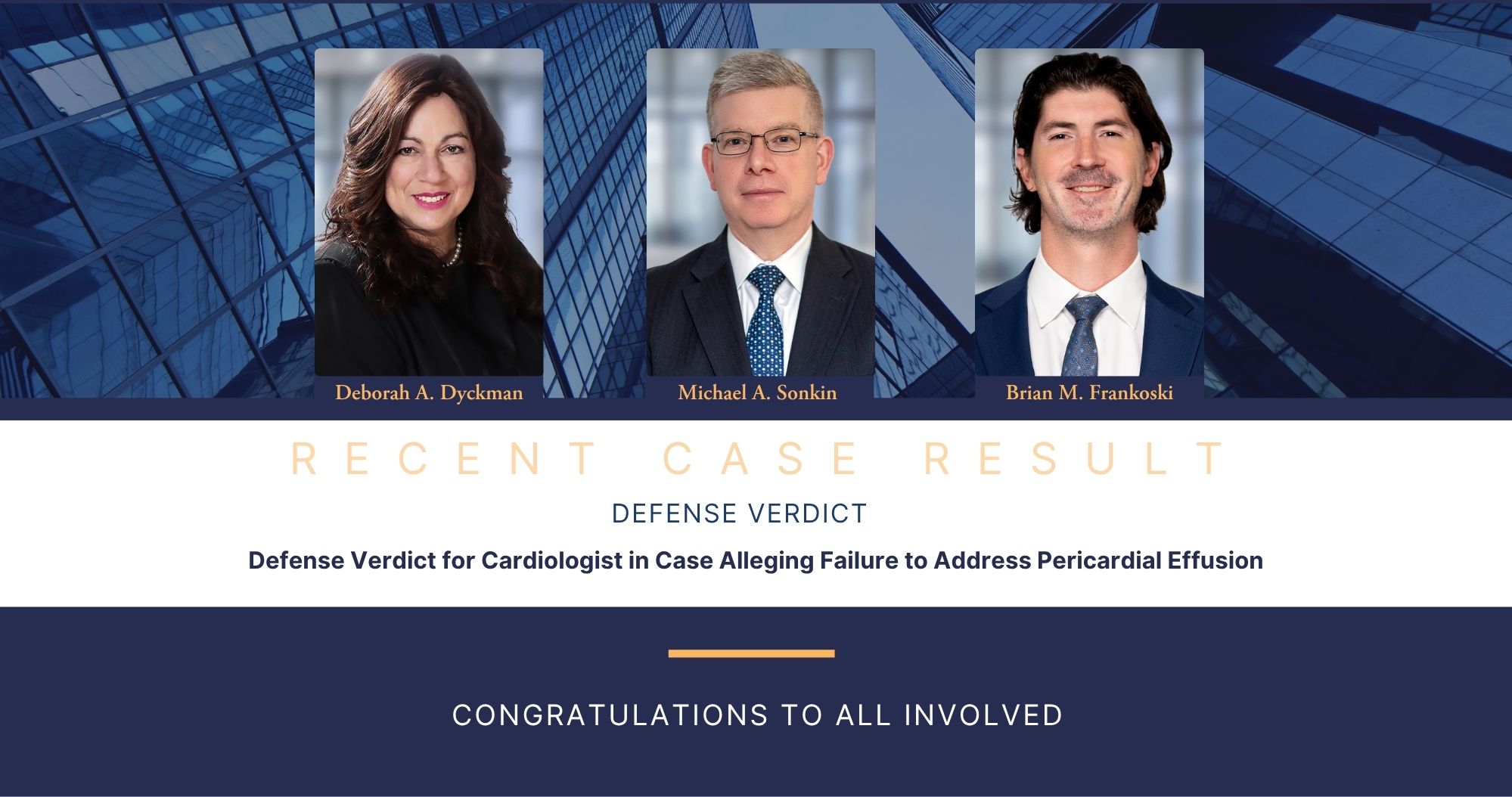 Senior Trial Partner Michael A. Sonkin, Partner Deborah A. Dyckman and Senior Associate Brian M. Frankoski, along with Jillian Kuper, successfully obtained a unanimous defense verdict in Kings County after a three-week trial. The plaintiff, on behalf of the decedent, alleged that MCB’s client, a cardiologist, failed to appreciate the significance of a moderate pericardial effusion in a patient who had undergone coronary artery bypass surgery two weeks earlier for myocardial infarction and diffuse coronary artery disease, and was allegedly presenting at a post-operative clinic visit with severe shortness of breath due to a slow bleed into the pericardium. It was claimed that the pericardial effusion in a patient with severe shortness of breath required immediate hospital admission and close monitoring to avoid progression to tamponade.