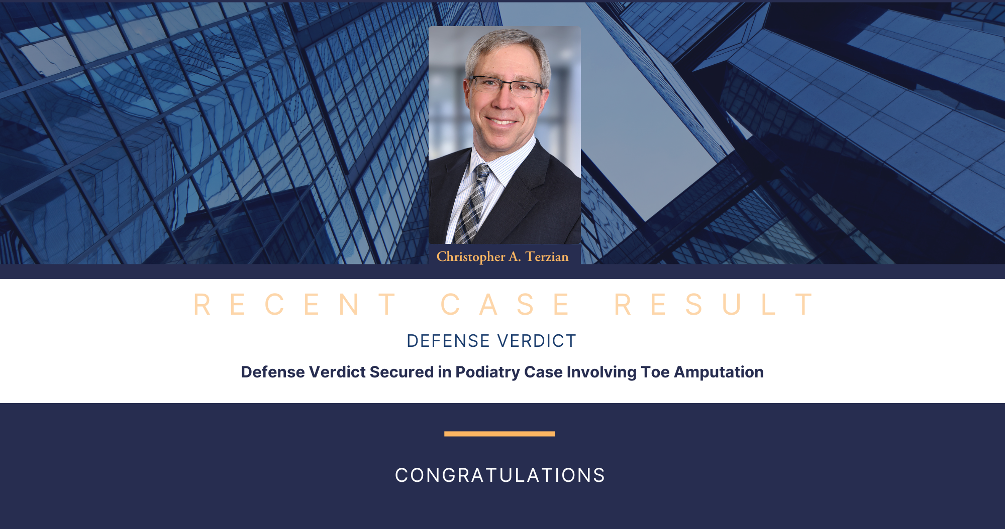 Senior Trial Partner Christopher A. Terzian successfully obtained a unanimous defense verdict on December 9, 2025, in Westchester County Supreme Court, in favor of MCB’s podiatrist client, just 15 minutes after jury deliberations following a weeklong trial.