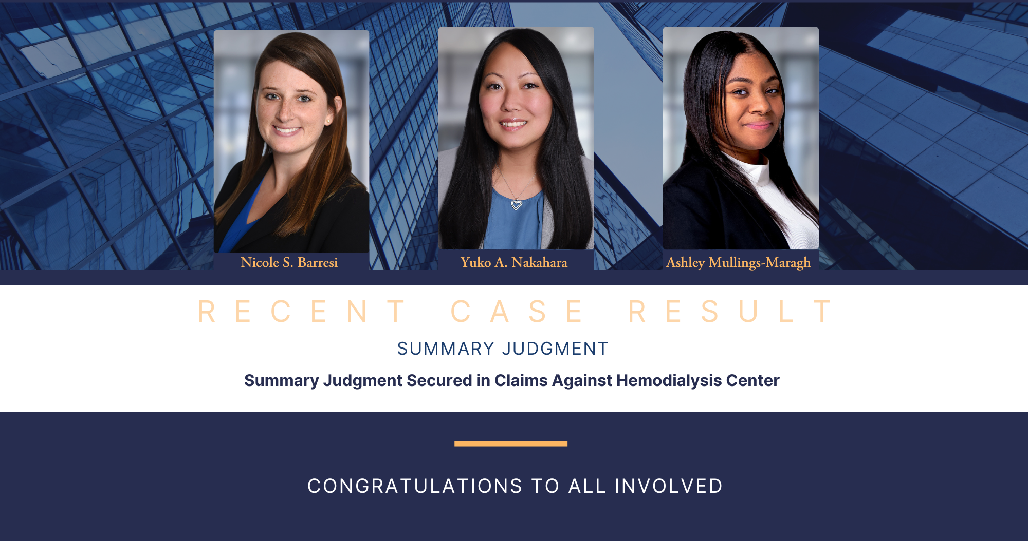 Senior Trial Partner Yuko A. Nakahara, Partner Nicole S. Barresi and Associate Ashley Mullings-Maragh successfully obtained Summary Judgment in a case where the Plaintiff alleged that MCB’s client, a Hemodialysis Center, was negligent in their post-treatment supervision of a patient by allowing her to suffer a fall and sustain injuries that were claimed to have led to her death.