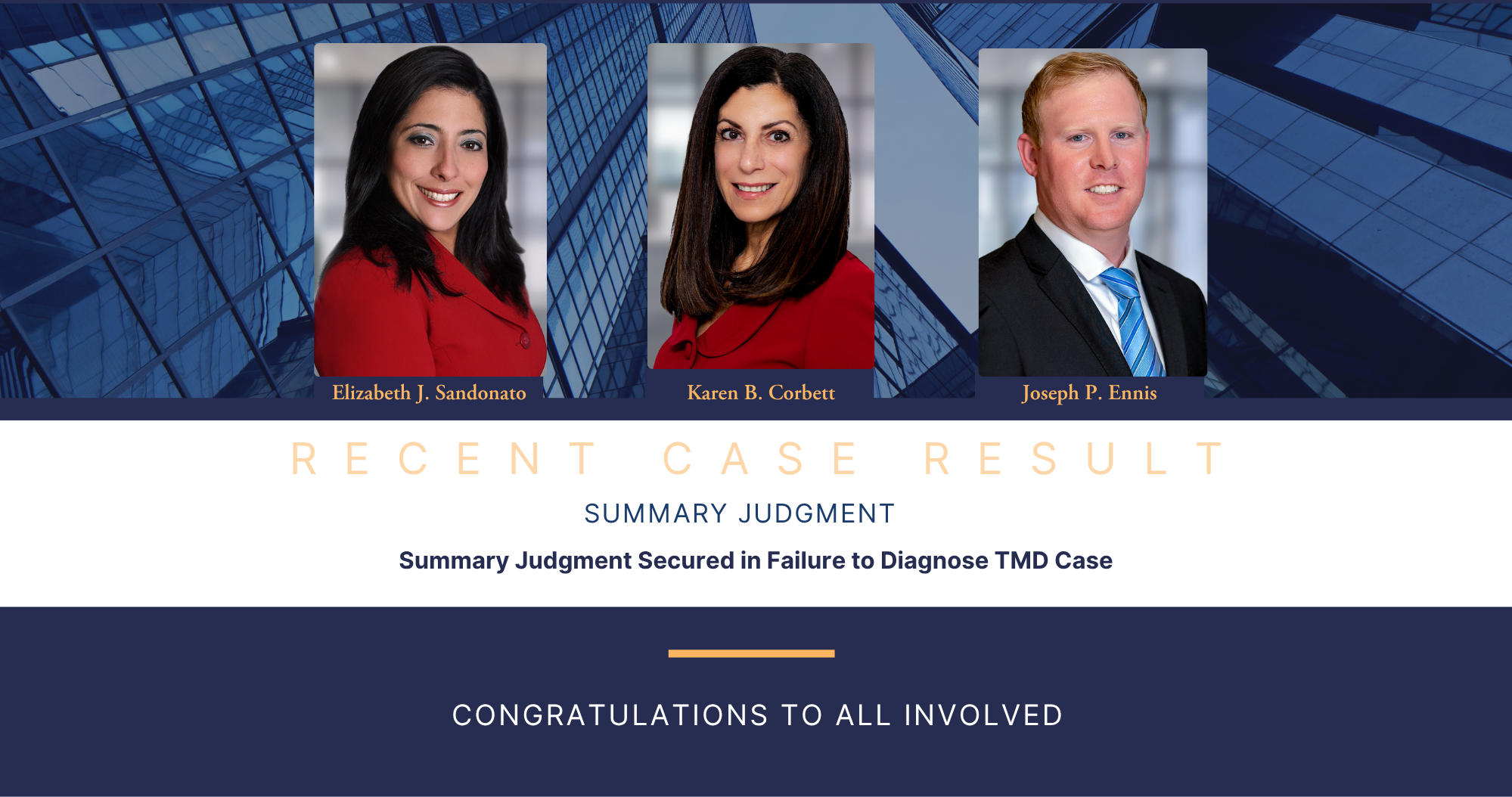 Senior Trial Partner Karen B. Corbett, Partner Elizabeth J. Sandonato, and Senior Associate Joseph P. Ennis obtained Summary Judgment in Nassau County Supreme Court, for MCB’s client, a general dentist, in a case involving a then 57-year-old plaintiff who alleged a failure to timely diagnose and treat temporomandibular joint disorder (“TMD”), as well as the improper extraction of a bottom right rear wisdom tooth, which she claimed caused her to develop temporomandibular joint disorder (TMD), necessitating the extraction of all of her natural teeth and replacement with a full mouth of dental implants. The plaintiff further claimed that she sustained arthritis in her left knee andosteopenia in her left hip as a result of the alleged malpractice.